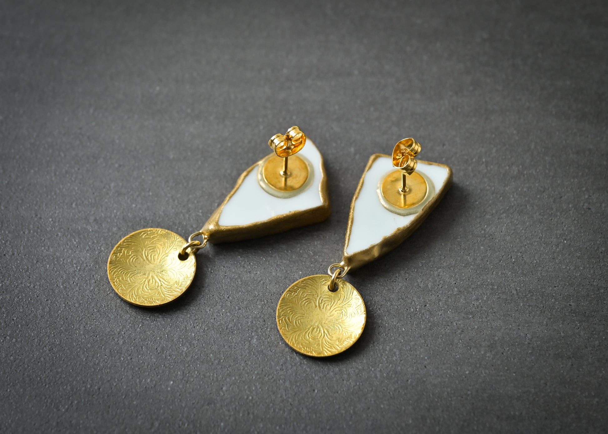 These earrings are crafted from pottery fragments that were set aside during the tableware manufacturing process. Though never used as dishes, the pieces are given new life through the art of kintsugi—a traditional Japanese method of repair using gold.